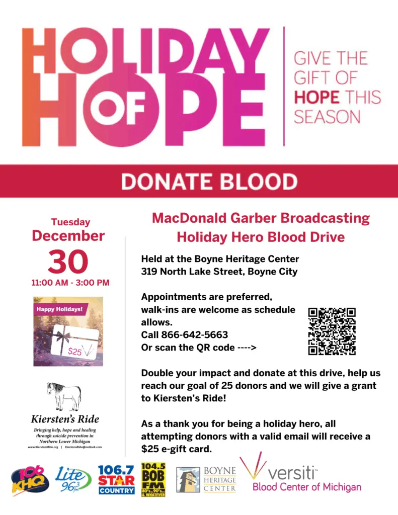 Join 106 KHQ for a Blood Drive for Holiday Heroes on Tuesday December 30th from 11am-3pm at the Boyne Heritage Center in Boyne City.